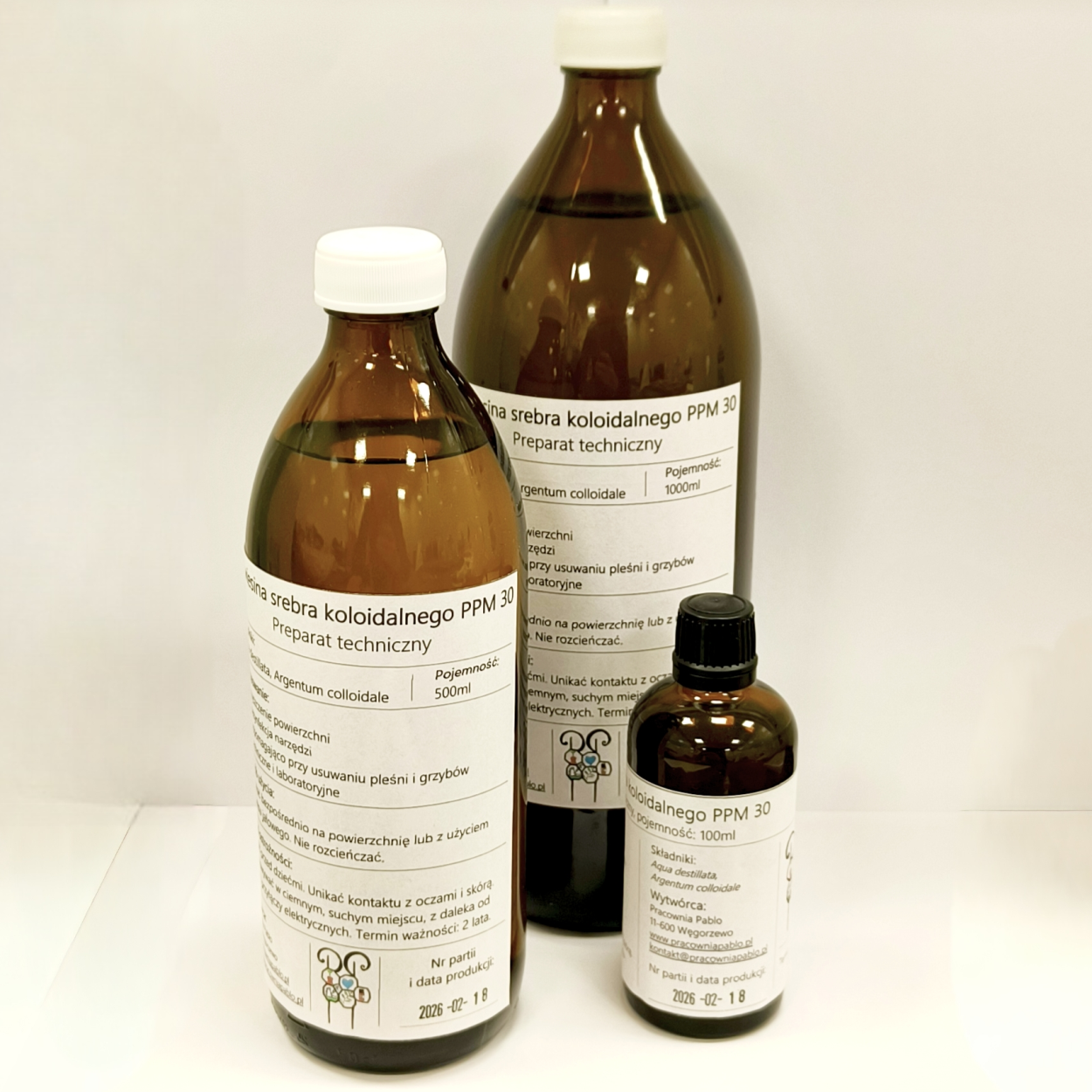 Przezroczysta zawiesina srebra koloidalnego. Produkt powstaje w rzemieślniczej pracowni i cechuje się stabilnością i jednolitym stężeniem metalu szlachetnego.